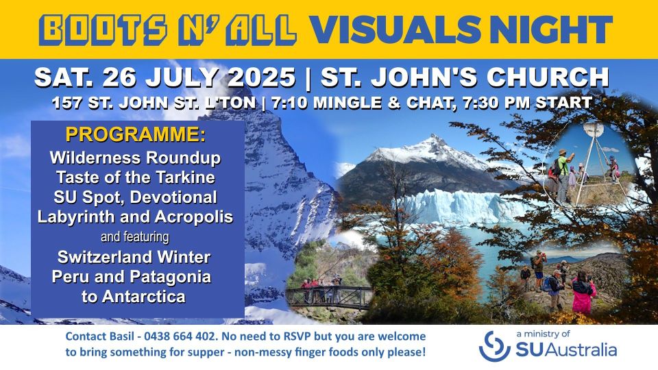 Boots N’ All Visuals Evening came and went on Sat. 26th July, this time in the spectacular St. John’s Church, with its new, improved heating system. Still not toasty, but warm enough, and the gathering of friends, retired leaders and walkers, current leaders, Boots N’ All walkers and those from other groups, and people who just came to see the beautiful scenery, made it a great occasion.