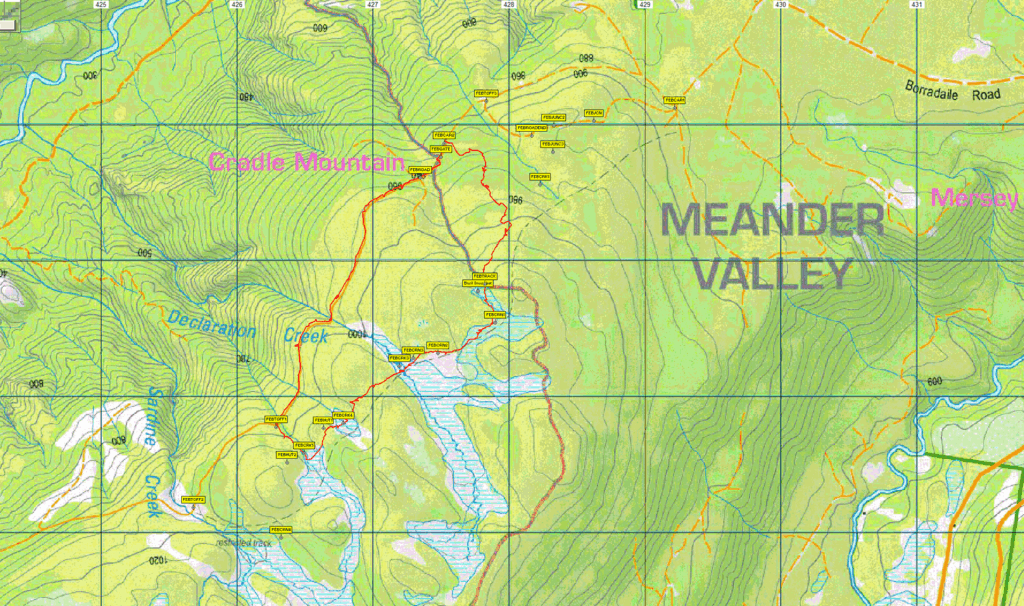 February Plains: 1:100000 map is Mersey (Tasmap 8114) and 1:25000 map is Borradaile (TasMap 4238)