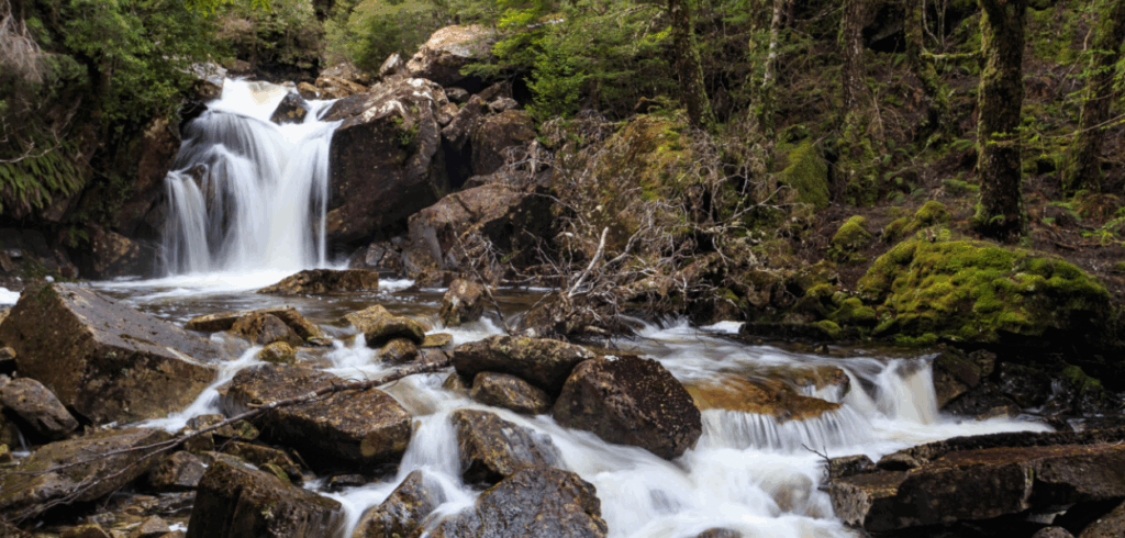 The walk begins at the very end of the Mersey Forest Road, south of Lake Rowallan. A kilometre south, after crossing the Jackson Creek footbridge, the route heads west for a few hundred metres to reach Moses Creek, which is then followed uphill, rising nearly 200m, for just under a kilometre to reach Horeb Falls. The best part of another km upstream, with a further 150m climb, brings the walkers to Meribah Falls, which is less than 200 metres from the north end of Chalice Lake. The going is somewhat scrubby from Meribah Falls to the Grail Falls track, a little over a kilometre away via the eastern shore of the lake. From Grail Falls, the Junction Lake track is followed back to the Jackson Creek crossing and the car. Total walk distance is about 10km. Because of the off-track walking and patches of scrub, this walk should be considered medium-hard, but energetic and resilient older children would manage it well.