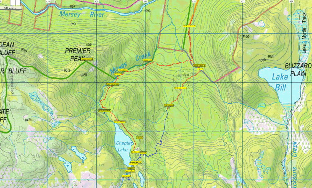 To access the area from Launceston, proceed along the Bass Highway to Deloraine (about 51 km), but do not turn off at the eastern exit into Deloraine. Instead, continue across Meander R. and up hill to the western exit, and to the roundabout at start of Mole Creek Rd. A further 24km will bring you to Mole Creek (sometimes used as a meeting place for our walks – check with leader). Continue west past Mole Creek, on what is now Liena Rd, making sure you turn south at the caravan park 4 km from the town. The road continues west until about 14 km from Mole Creek, it branches south, now called Mersey Forest Road. A little over 6 km south, you will pass turnoffs to Cradle Mountain and Devil’s Gullet (Lake Mackenzie) but keep going south, crossing the Mersey at Lake Parangana and passing the turnoffs for Bare Hill and Arm River. Another 17 km should see you cross below the Rowallan Dam. Continue south along the east side of Lake Rowallan, for about 16 km, by which time you are south of Lake Rowallan, until you reach the very end of the road and the beginning of the Moses Creek walking track.